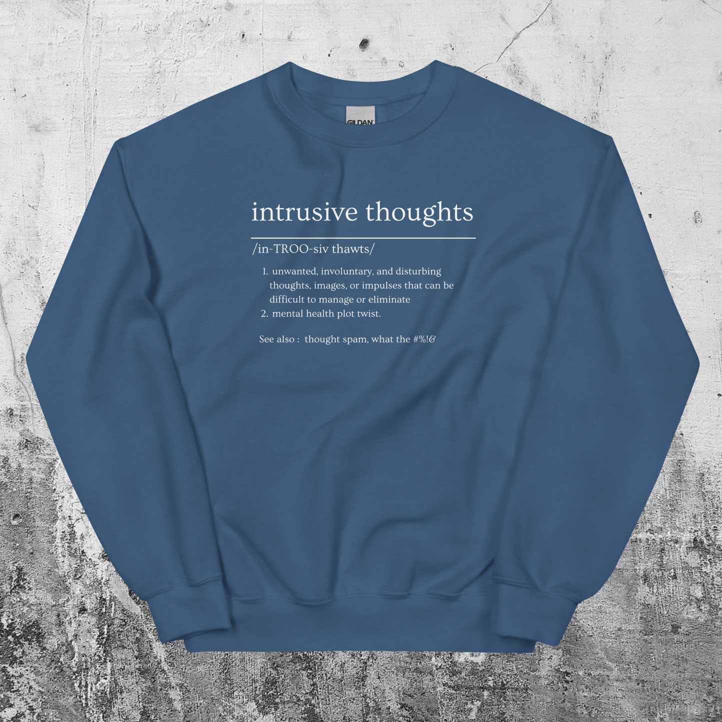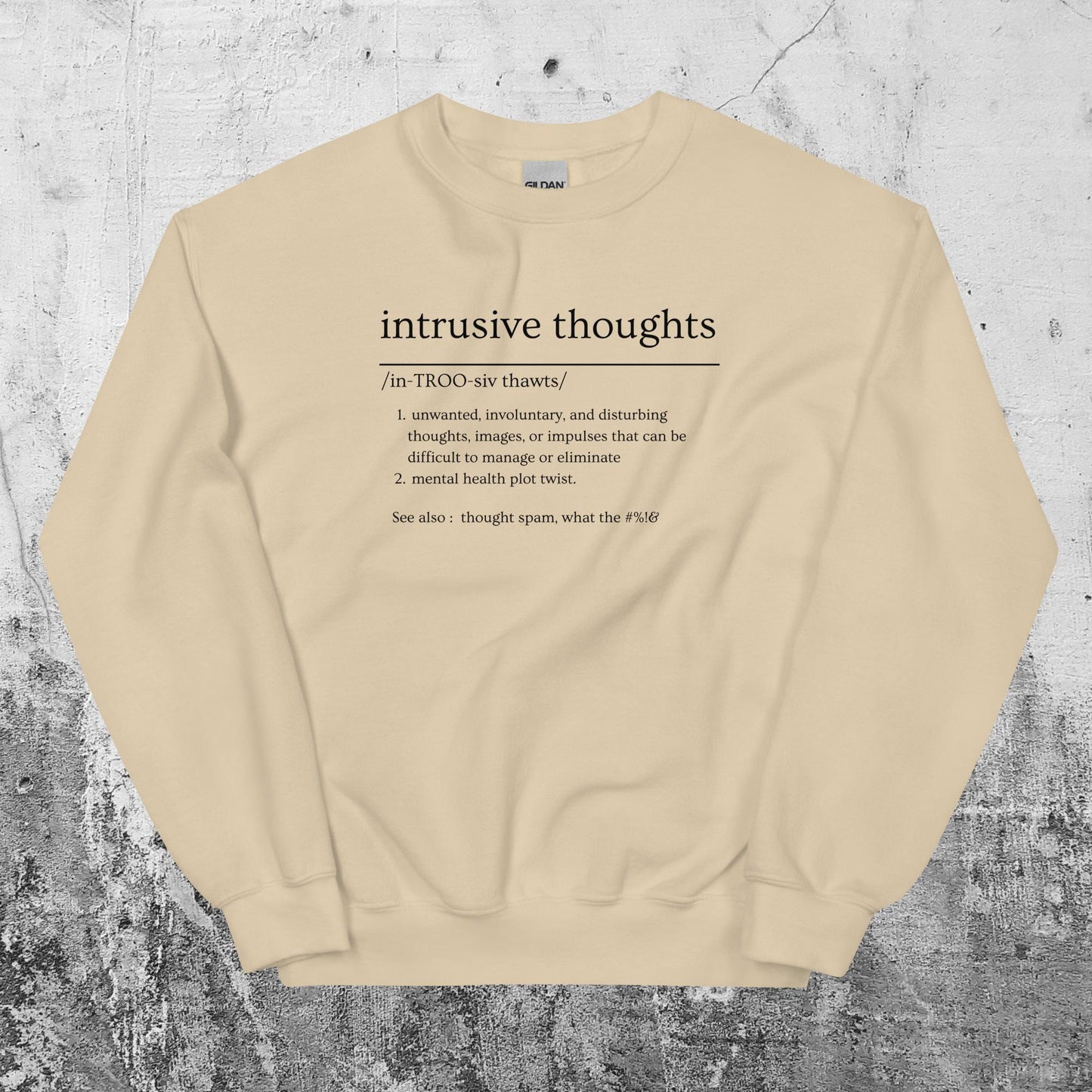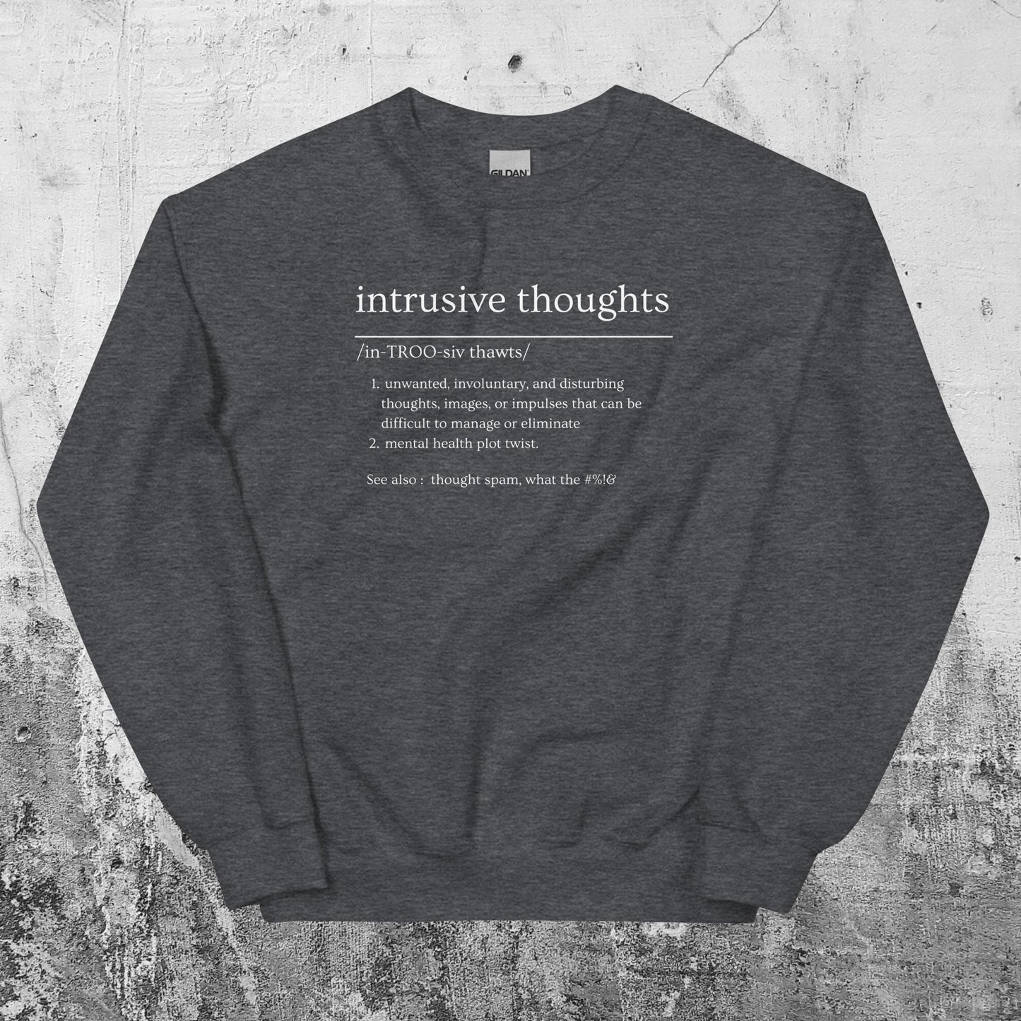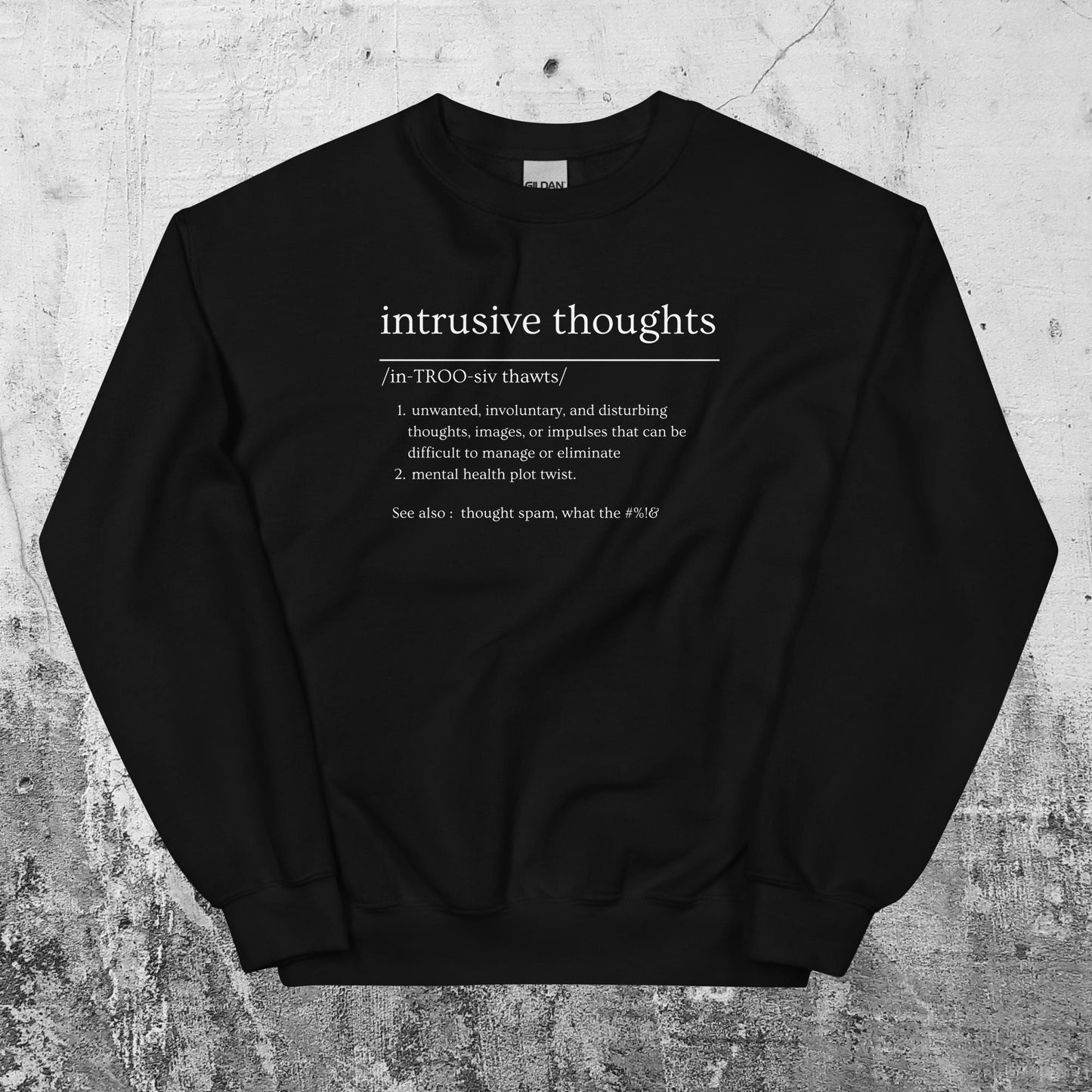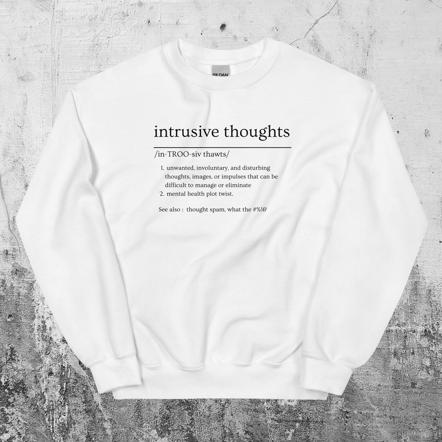 Cozy up in truth with our 'Intrusive Thoughts' definition crewneck. Perfect for those who know the struggle, but need a light hearted look on their mental noise. This sweatshirt turns vulnerability into strength while keeping you stylish and warm.