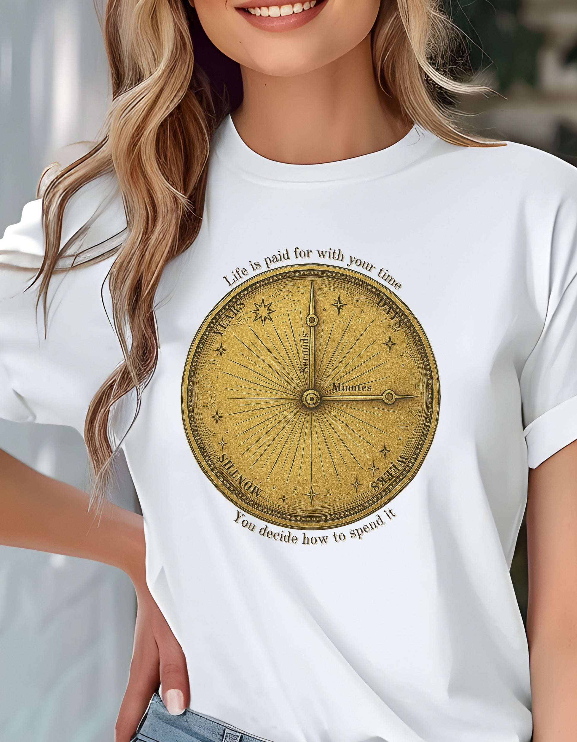 A thoughtful reminder that time is our most valuable currency. This thought-provoking tee features a detailed clock design labeled with seconds, minutes, days, weeks, months, and years—symbolizing how every moment counts. Designed for women who want their style to reflect deeper meaning, it’s more than apparel—it’s a wearable affirmation to invest your energy in what truly matters. Soft, comfortable, and empowering, this shirt is a daily nudge to protect your peace and prioritize your purpose.